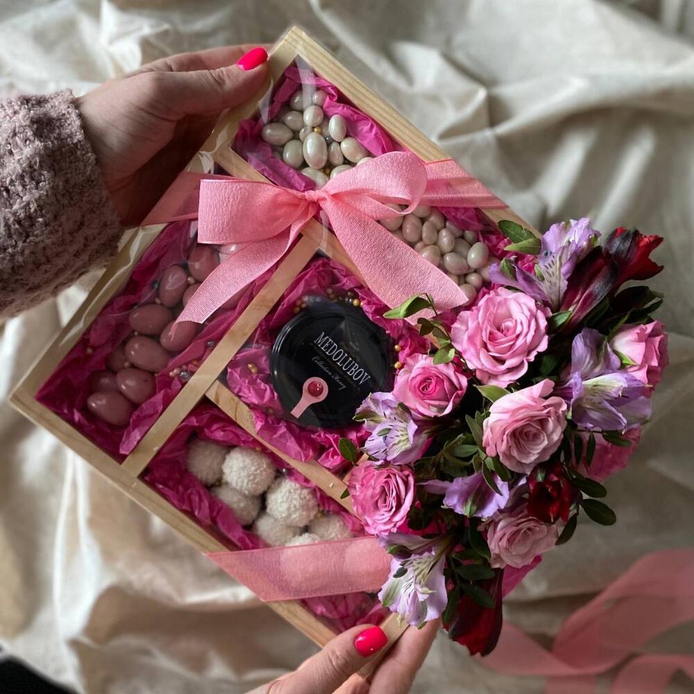 “Атлас☁️” – цветочная композиция с зефиром в деревянном ящике