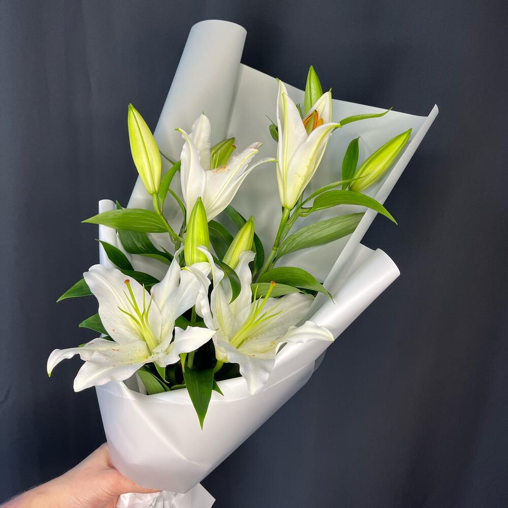 Лилия белая – 3 шт.Пленка матовая – 2 шт.Лента атласная – 1 шт.