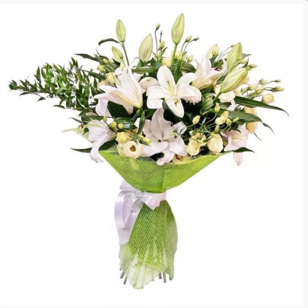 Букет из белых лилий с эустомой и зеленью