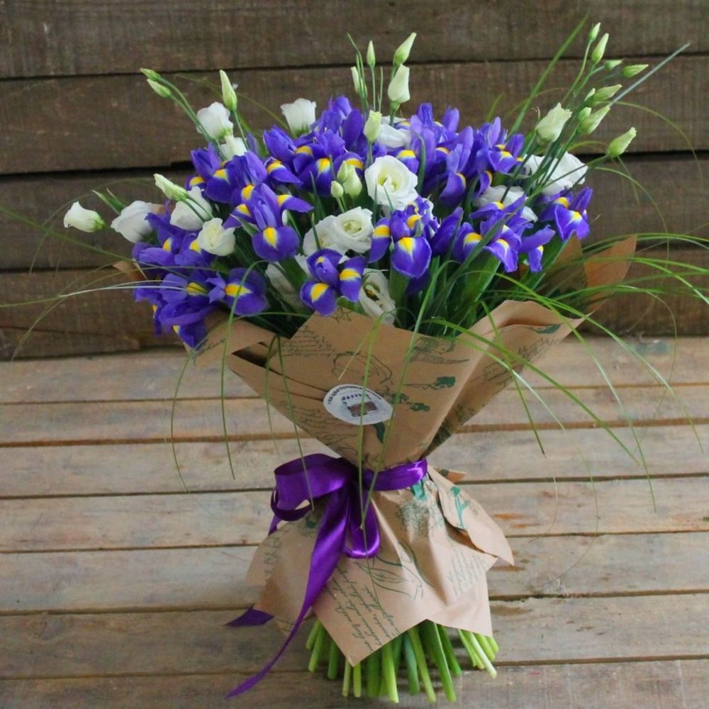 Ирис – 15 шт.Зелень – 15 шт.Эустома – 7 шт.Крафт – 1 шт.