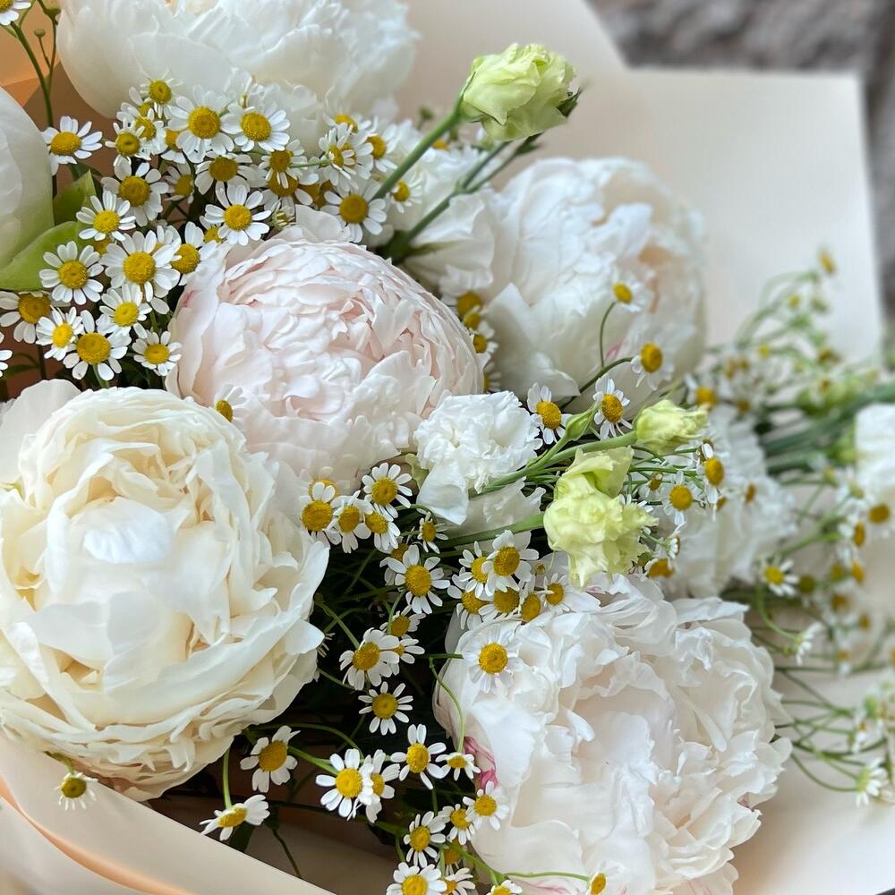 Эустома – 1 шт.Лента атласная – 2 шт.Ромашка кустовая – 7 шт.Пион белый – 6 шт.Упаковка дизайнерская – 5 шт.