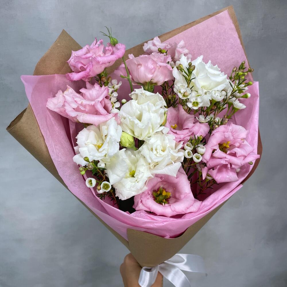 Лизиантус – 3 шт.Ваксфлауэр – 2 шт.Упаковка тишью – 1 шт.Упаковка крафт – 1 шт.Лента атласная – 1 шт.