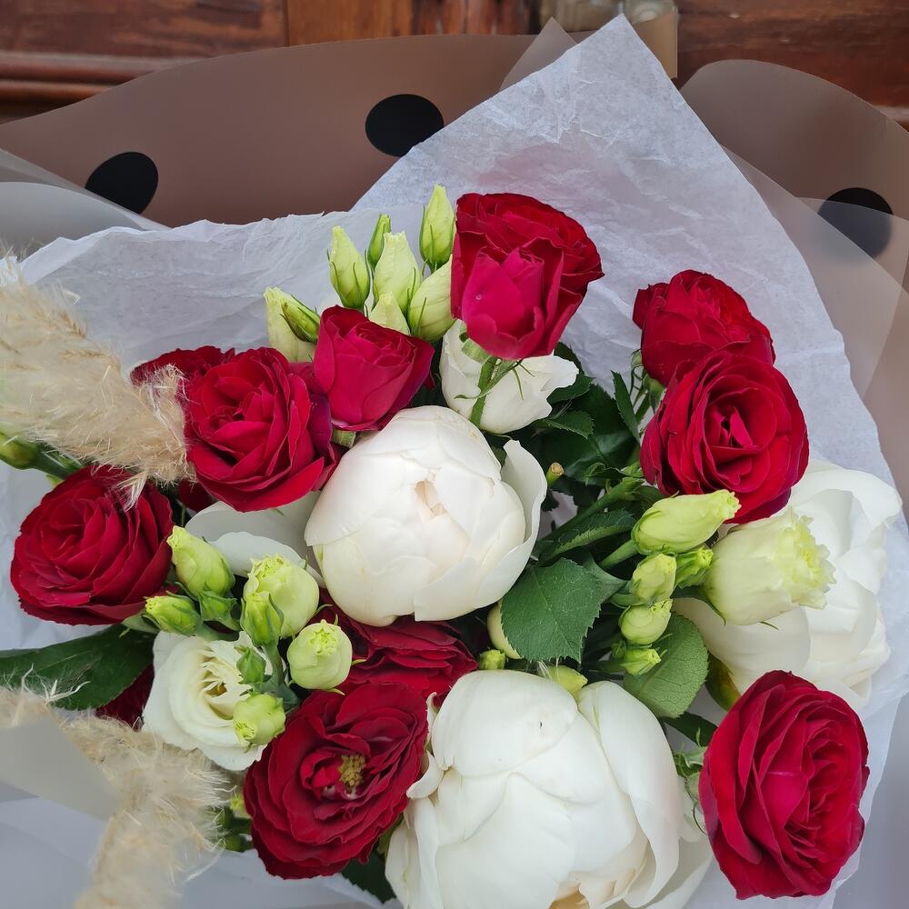 Комплимент из белых пионов и кустовой розы❣️