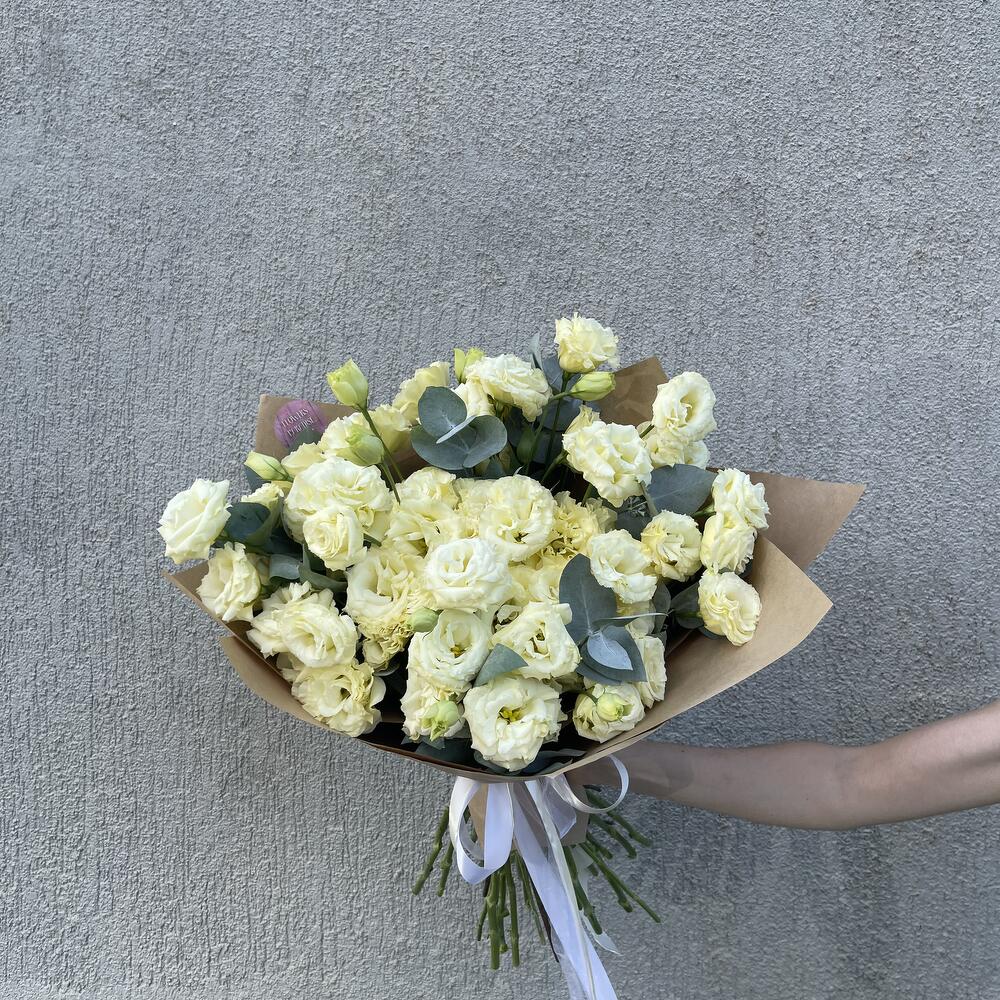 Эустома – 27 шт. Эвкалипт – 3 шт. Упаковка – 1 шт. Атласная лента – 1 шт.