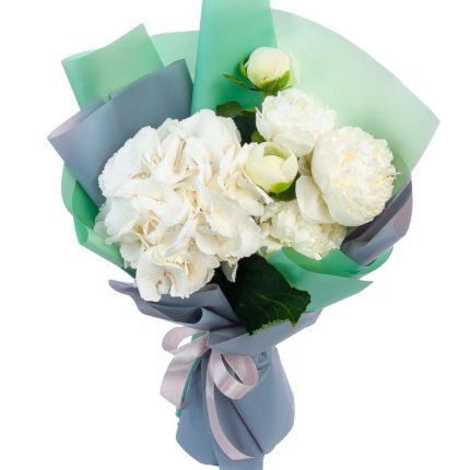 Букет в фиолетово-зеленых оттенках из гортензий, вибурнума, клематиса
