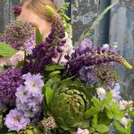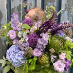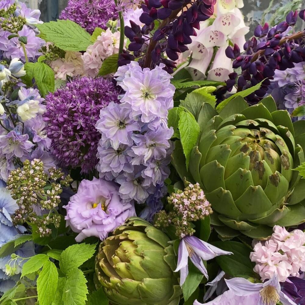 Садовая корзина, с артишоками, гортензиями, ветками малины, люпинами, дельфиниумом, клематисом, колокольчиками, маттиолой и травами.