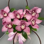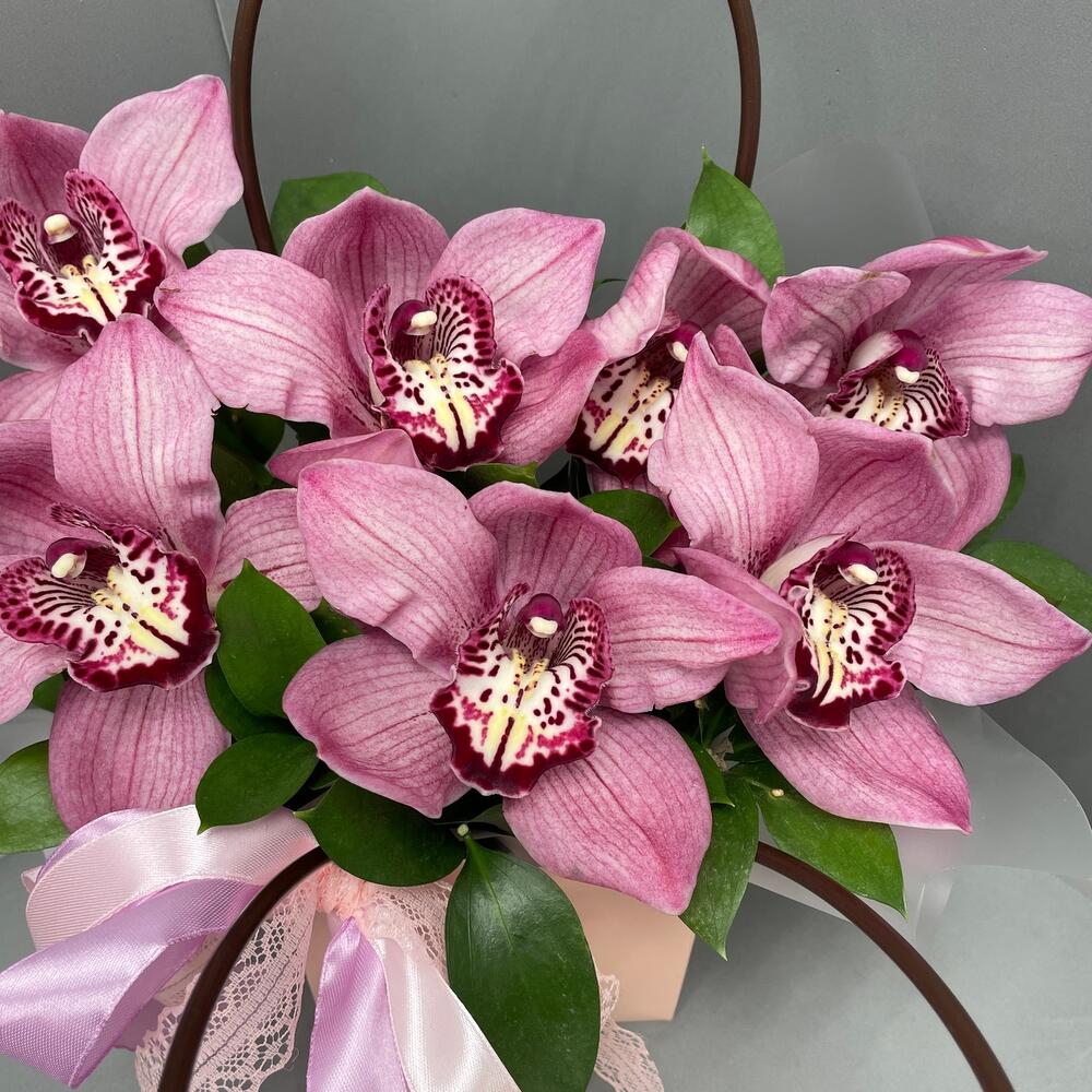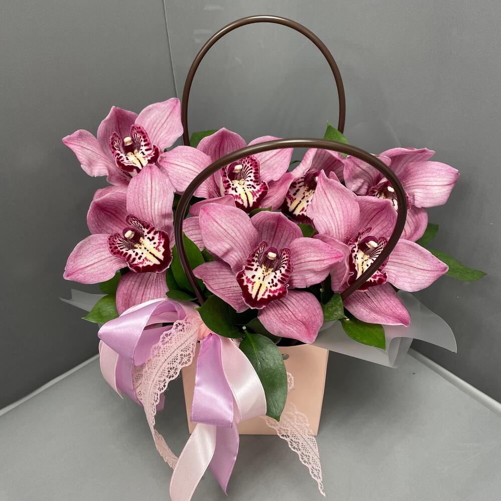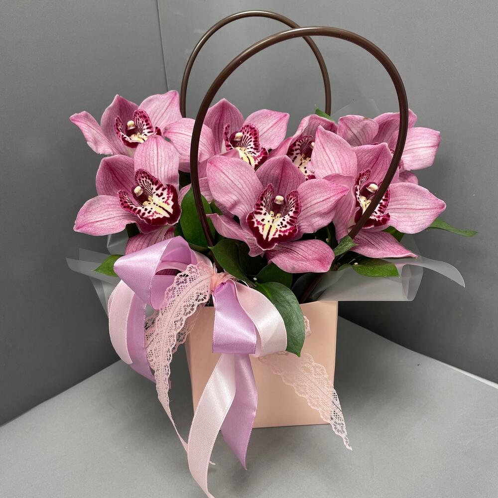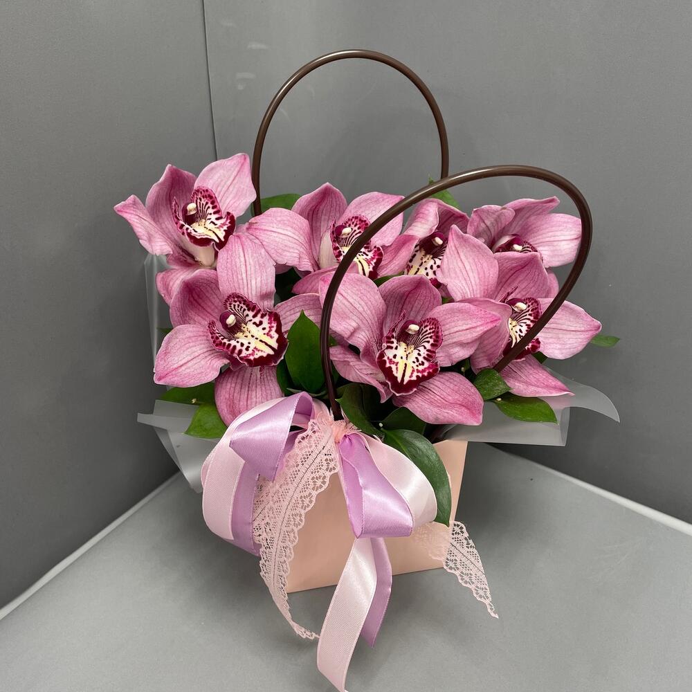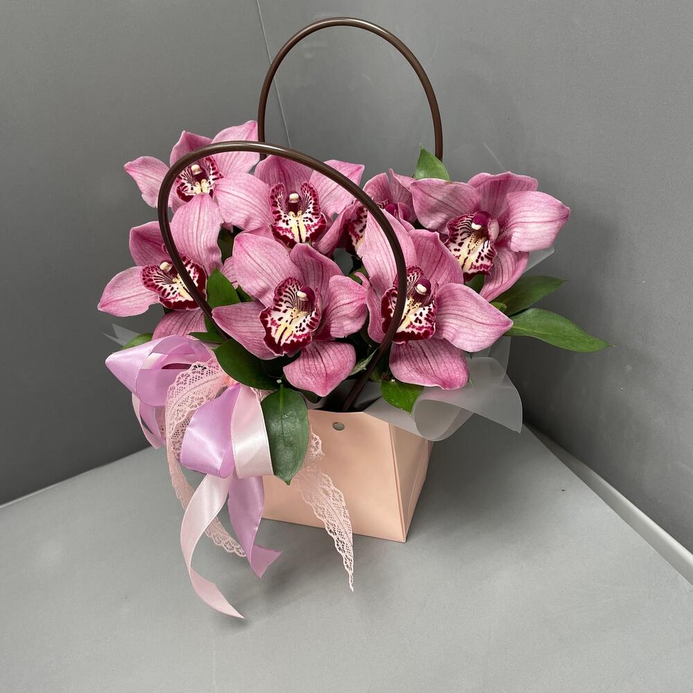 Орхидеи – 7 шт.Рускус – 3 шт.Сумочка – 1 шт.Оазис флористический – 1 шт.Оформление лента – 2 шт.