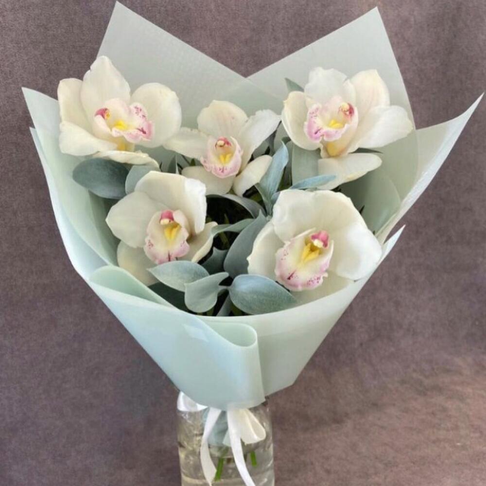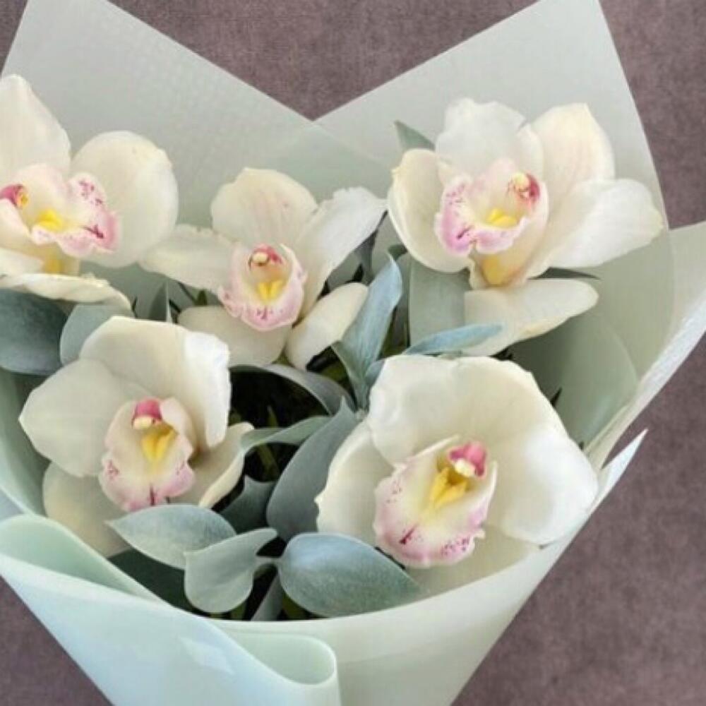 Орхидея Цимбидиум – 5 шт.Лента атласная – 1 шт.Упаковка дизайнерская – 1 шт.рускус крашеный – 6 шт.