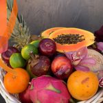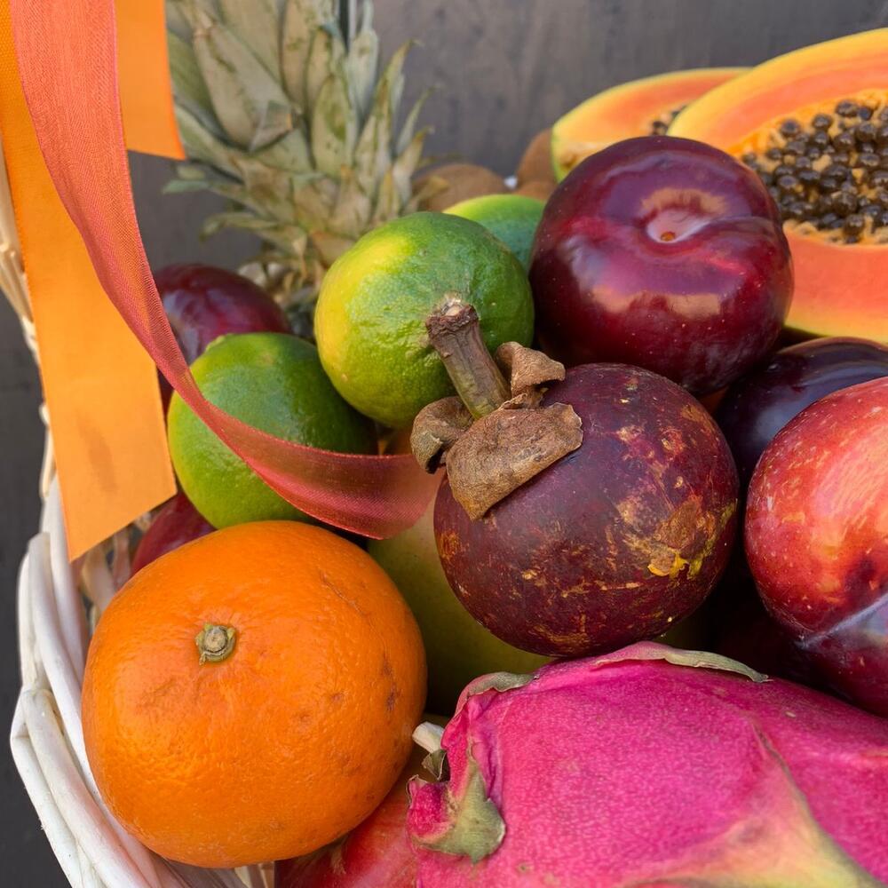Корзина плетеная – 1 шт.Ананас – 1 шт.Папайя – 1 шт.Кокос – 1 шт.манго – 1 шт.Драгон фрукт – 1 шт.мангостан – 2 шт.Гуава – 2 шт.киви 500 гр – 1 шт.яблоки 1000гр – 1 шт.мандарины 800 гр – 1 шт.Лайм – 3 шт.Лимон – 1 шт.Слива красная – 5 шт.Орхидея Цимбидиум – 3 шт.Лента атласная – 3 шт.