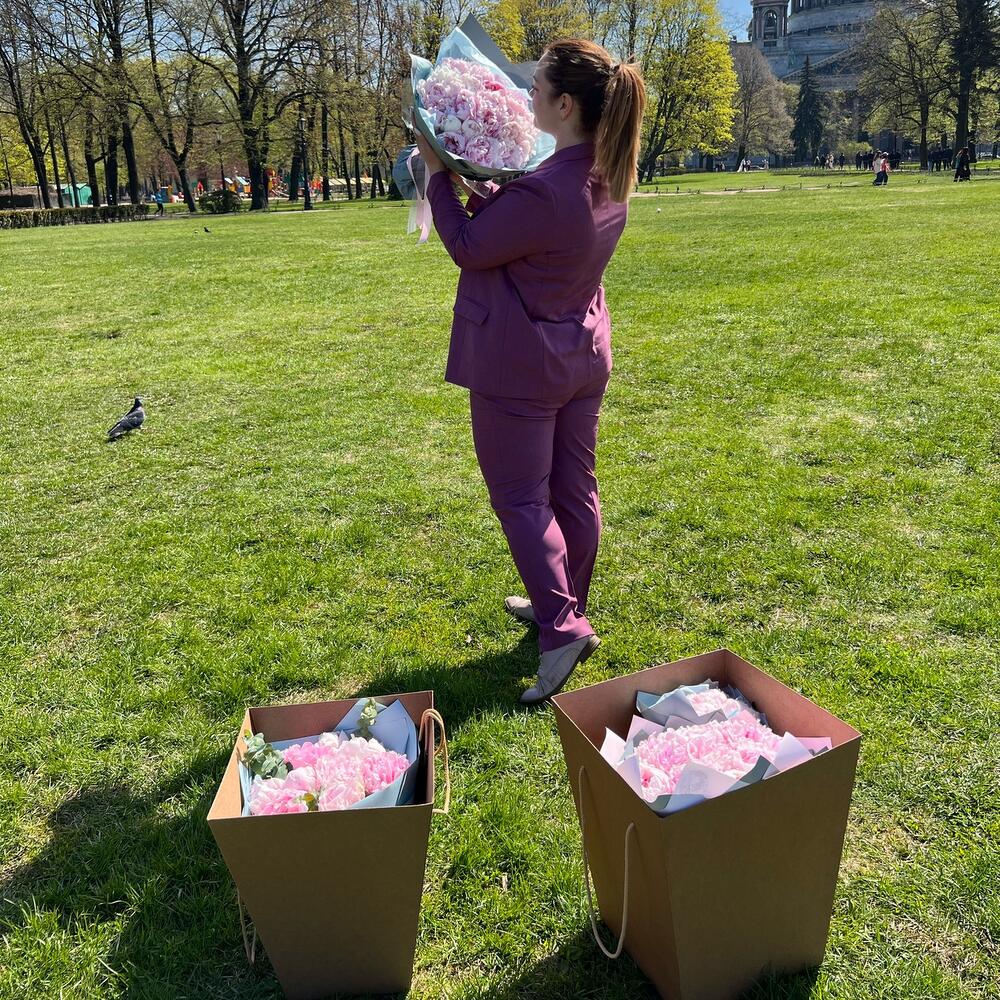 Лента атласная – 2 шт.Пион Сара Бернар – 25 шт.Упаковка дизайнерская – 2 шт.коробка транспортировочная – 1 шт.подкормка для срезанных цветов – 1 шт.крафт конверт – 1 шт.инструкция по уходу за цветами – 1 шт.аквапак с водой – 1 шт.