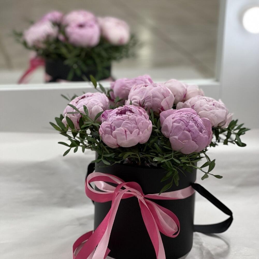 7 пионов Сара Бернард в шляпной коробке с зеленью фисташки