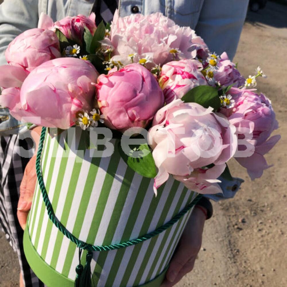 Атласная лента – 1 шт.Ромашка матрикария – 3 шт.пионы – 15 шт.шляпная коробка с оазисом – 1 шт.