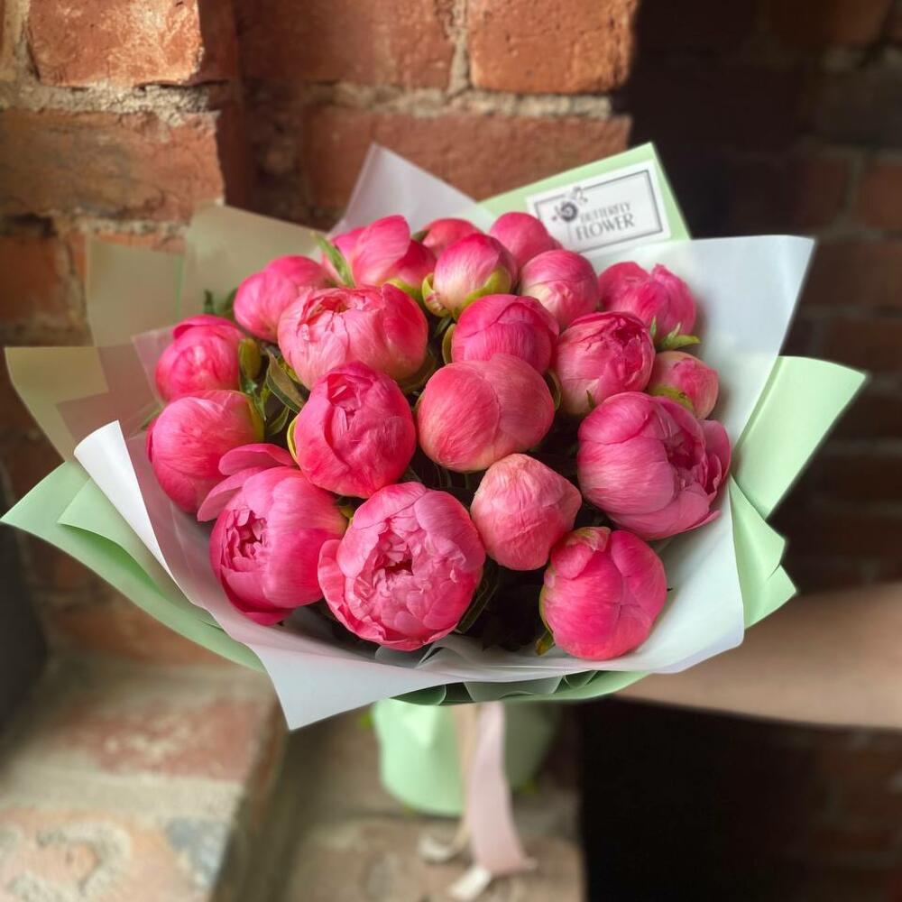 Букет из 21 кораллового пиона в дизайнерской упаковке "Коралл Саншайн"
