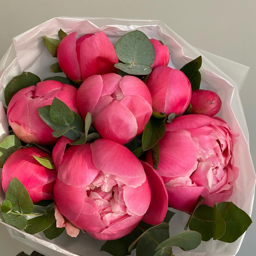 Монобукет из пионов корал шарм с эвкалиптом / 1370 id