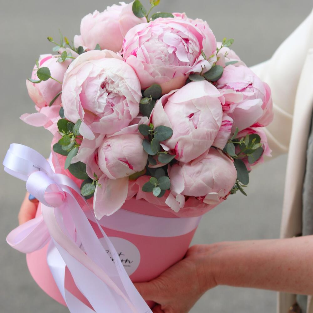 Пион розовый – 13 шт.Эвкалипт – 1 шт.Шляпная коробка – 1 шт.Открыточка с вашими пожеланиями – 1 шт.Шоколадка – 1 шт.