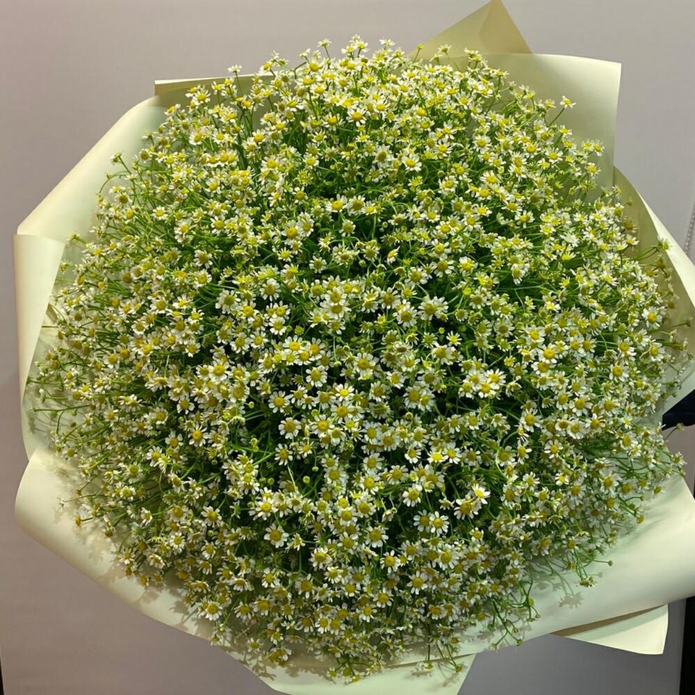 Матрикария (Ромашка Камила) – 101 шт.Упаковка дизайнерская – 1 шт.Лента атласная – 1 шт.