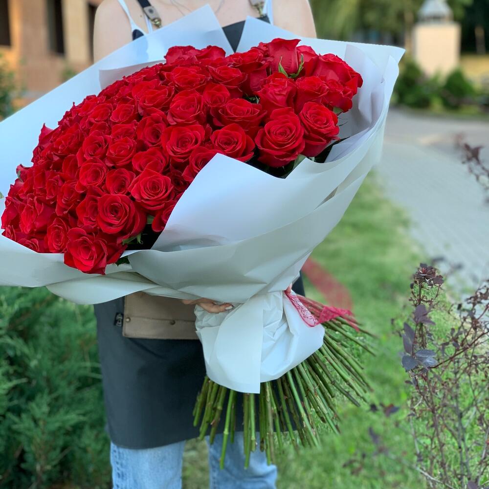 Букет, который впечатляет однозначно и бесповоротно. Букет из 101 розы. Чтобы каждый букет чувствовал себя хорошо долгое время, мы крепим пакетик кризала-средство, продлевающее жизнь цветочков
