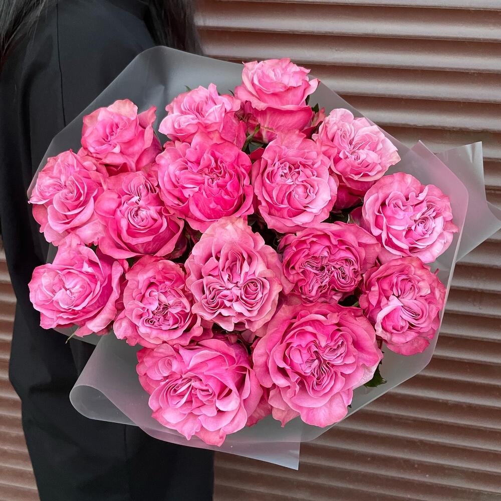 Лента атласная – 1 шт.Упаковка дизайнерская – 1 шт.розы пионовидные – 15 шт.