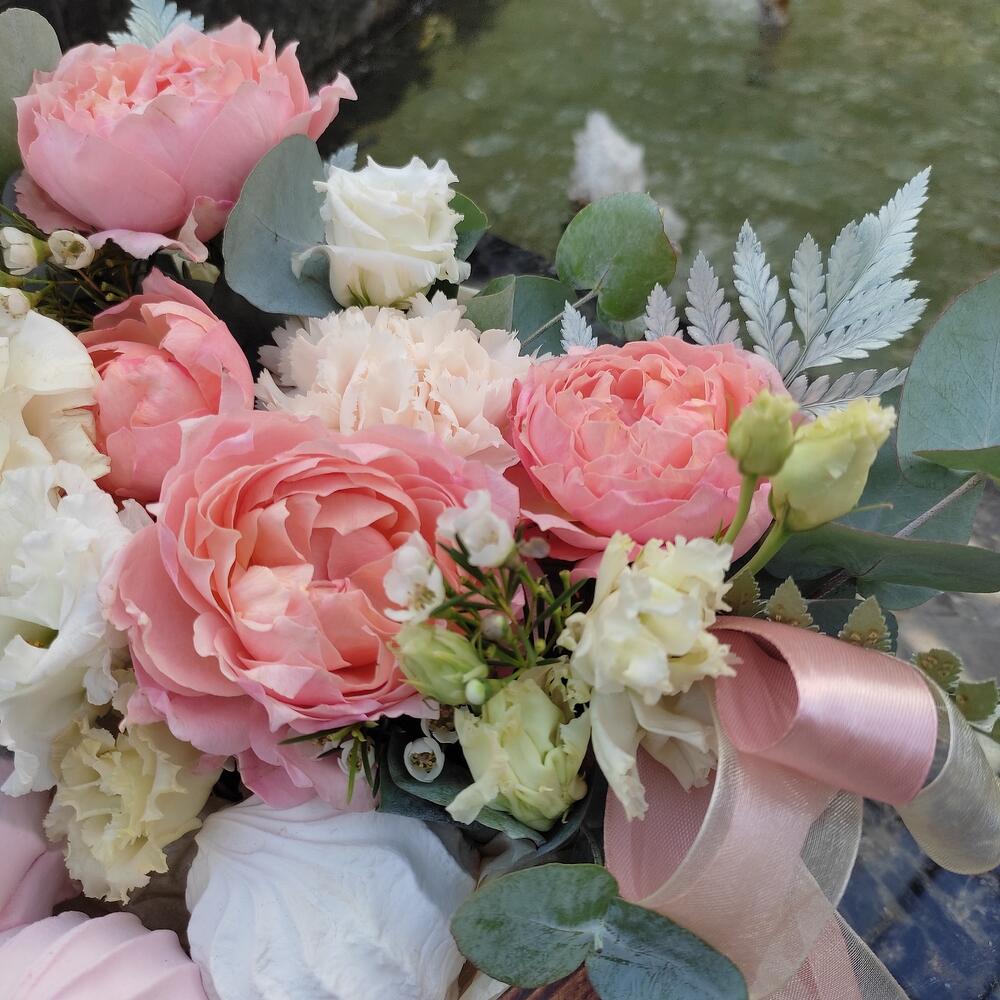 Роза пионовидная – 1 шт.Роза кустовая пионовидная – 1 шт.Диантус – 1 шт.Лизиантус – 1 шт.Ваксфлауэр – 1 шт.Эвкалипт – 1 шт.Папоротник – 2 шт.Зефир – 3 шт.Тишью – 2 шт.Лента – 2 шт.Ящик деревянный – 1 шт.