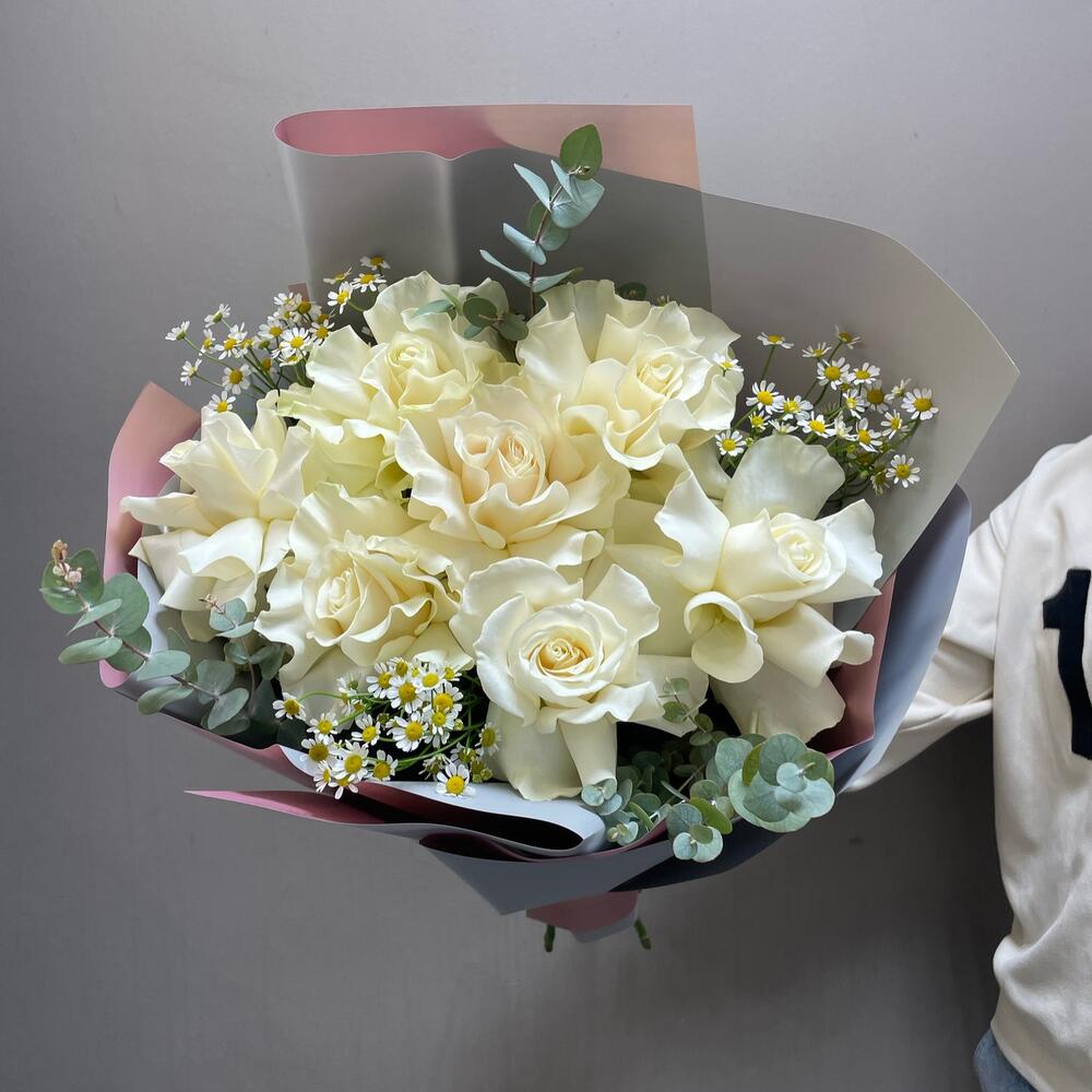 Эвкалипт – 2 шт.Лента атласная – 1 шт.Матрикария – 3 шт.Упаковка дизайнерская – 1 шт.Французская роза – 7 шт.