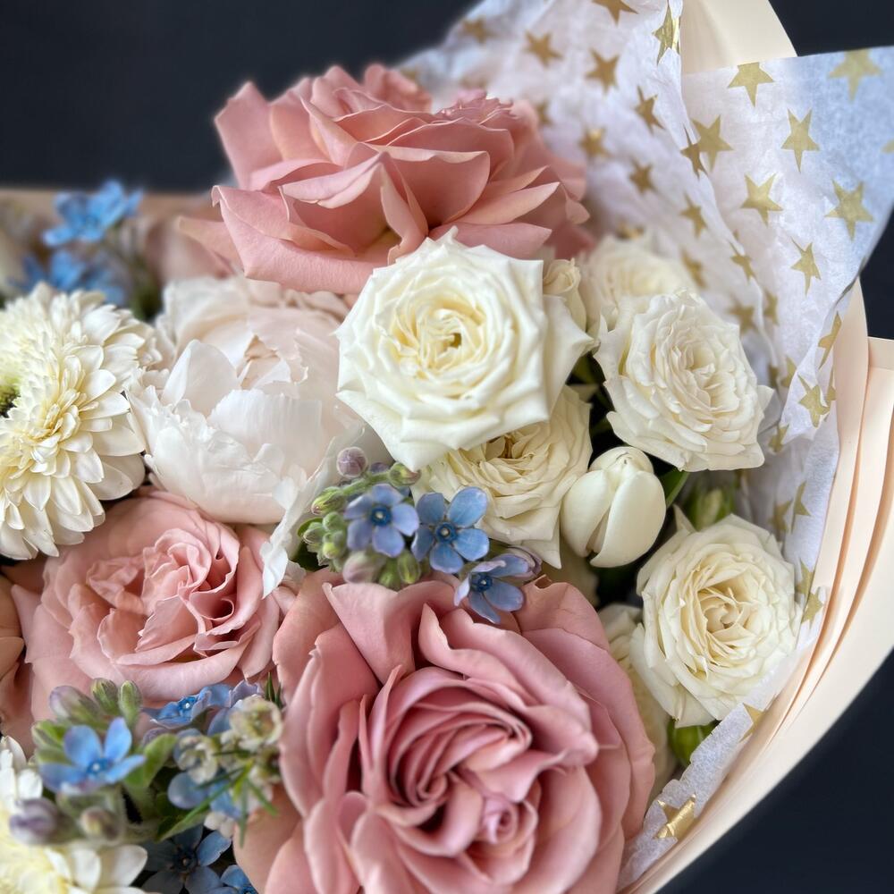 Пион – 1 шт.Тюльпан – 3 шт.Кустовая роза – 3 шт.Гербера – 3 шт.Хамелациум – 1 шт.Пионовидная роза – 3 шт.Оксипеталум – 3 шт.декоративная упаковка – 1 шт.Атласная лента – 1 шт.