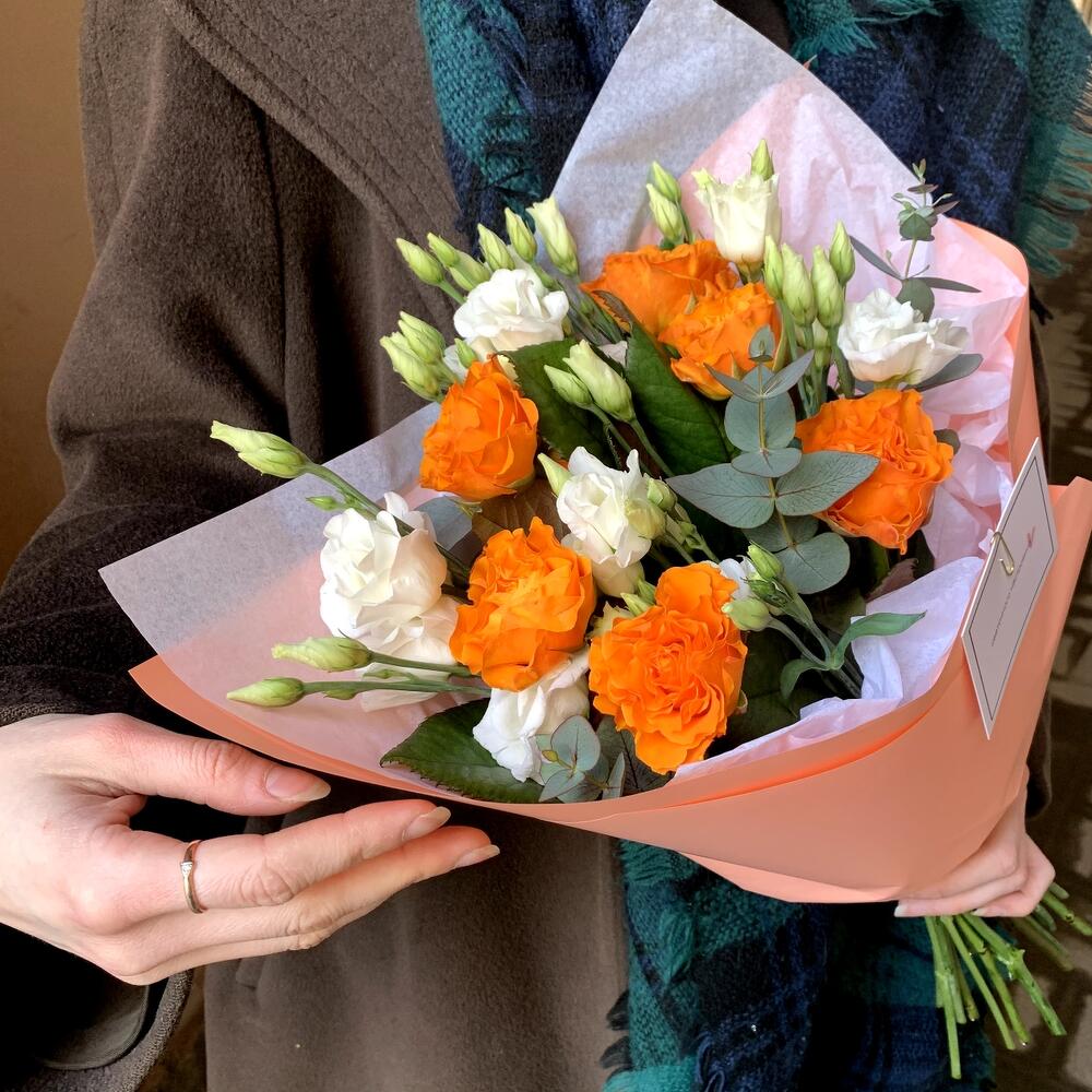 Эвкалипт – 1 шт.Лизиантус белый – 2 шт.Авторская упаковка – 1 шт.роза россия оранжевая – 7 шт.