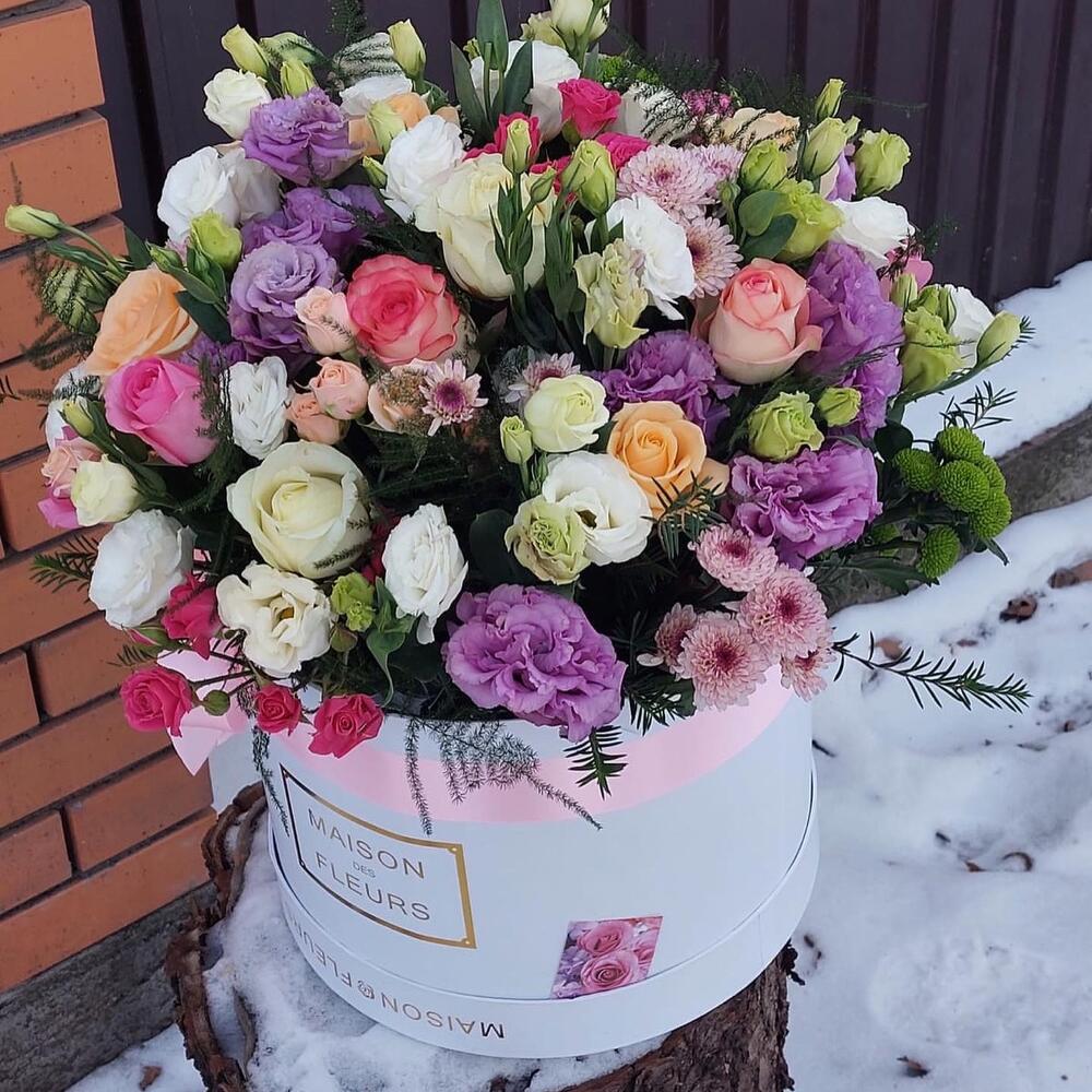 Роза кустовая – 5 шт. Хризантема кустовая – 5 шт. Эвкалипт – 5 шт. Эустома – 15 шт. розы разноцветные – 15 шт. коробка большая шляпная – 1 шт.