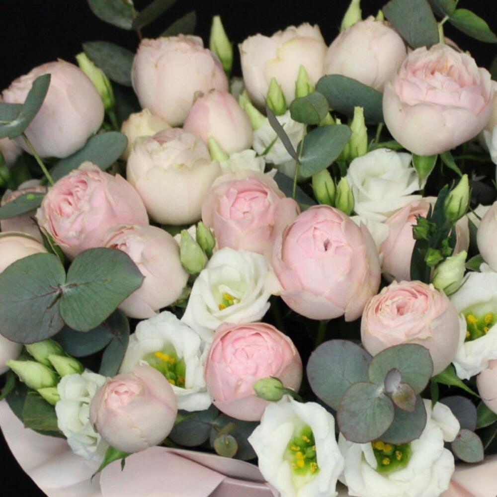 роза мэнсфилд парк – 6 шт.эустома белая – 7 шт.Эвкалипт Baby Blue – 3 шт.Коробка шляпная – 1 шт.Оазис флористический – 1 шт.
