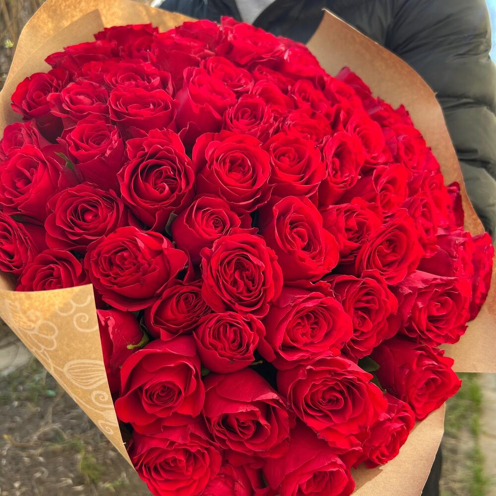 красная роза 40 см – 69 шт.Упаковка крафт – 3 шт.Упаковка пленка – 3 шт.