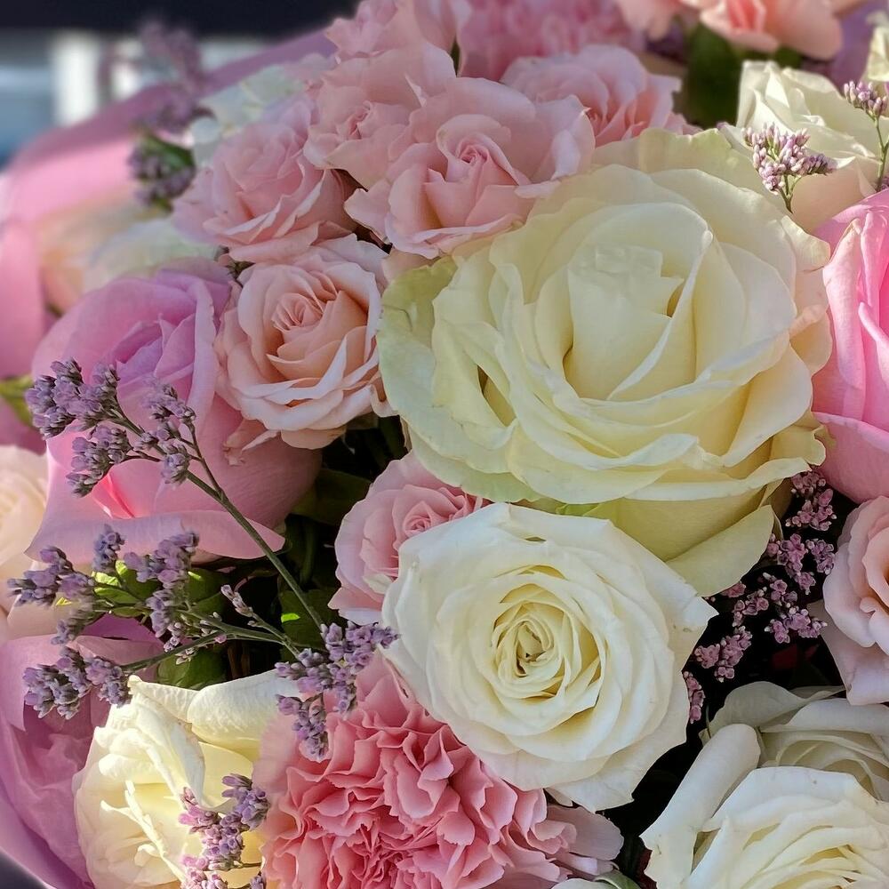 Альстромерии, Гвоздики, Кустовые розы, Лизиантусы, Розы, Хризантемы
