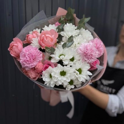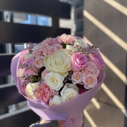 Альстромерия – 2 шт. Рускус – 2 шт. Кустовая роза – 1 шт. Эустома – 1 шт. Упаковка дизайнерская – 1 шт. французская роза пинк мондиаль – 5 шт.
