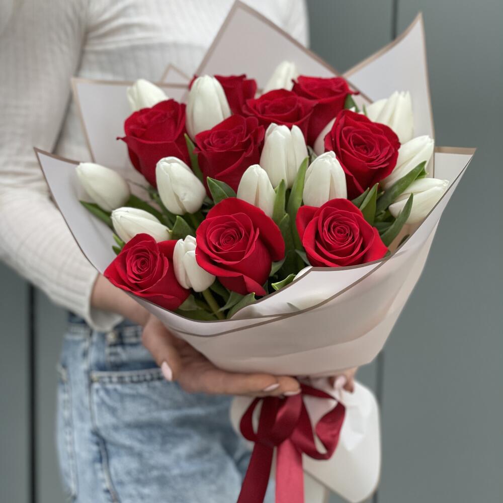 Букет Идиллия из красных роз и белых тюльпанов