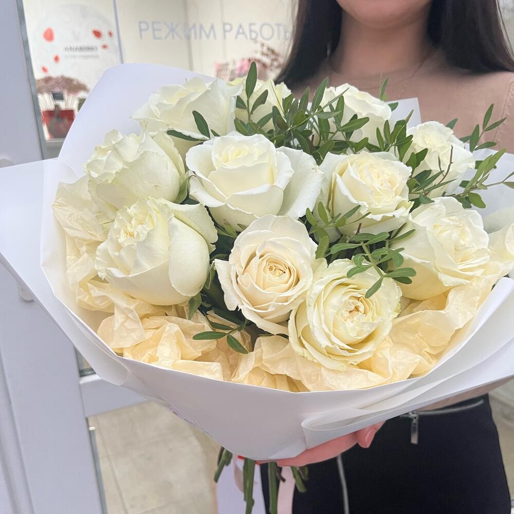 Букет из 11 белых роз с зеленью