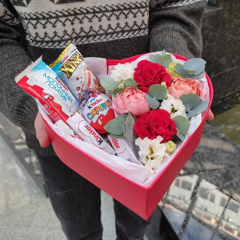 "Сладкое сердце " - цветочная композиция с сладостями в коробке "Сердце"