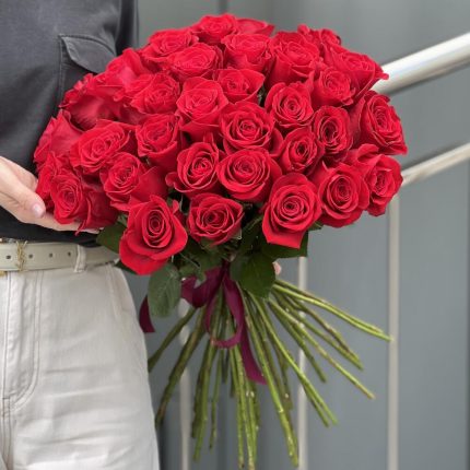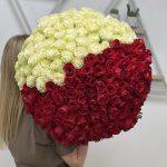 роза крансая – 101 шт. Роза белая – 100 шт. Оформление лента – 1 шт.