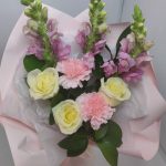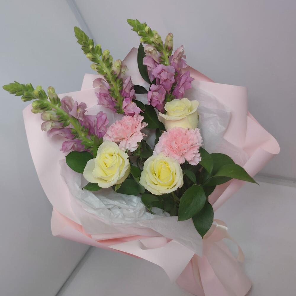 антиринум – 3 шт.Роза ванильная – 3 шт.Диантус – 2 шт.Рускус – 3 шт.Дизайнерская упаковка – 1 шт.