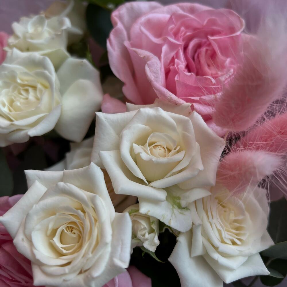 pink o’hara роза – 3 шт.Кустовая роза – 2 шт.Эвкалипт – 2 шт.Лагурус – 3 шт.декоративная упаковка – 1 шт.Атласная лента – 1 шт.