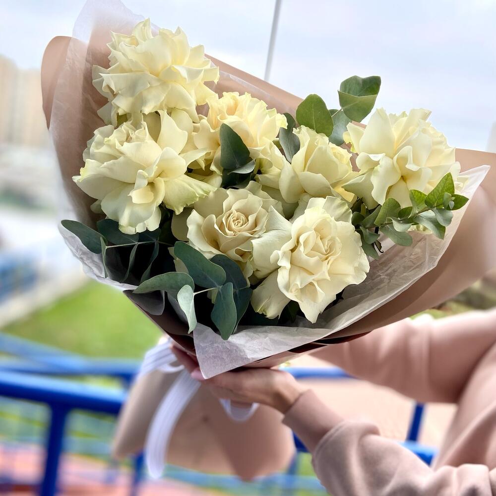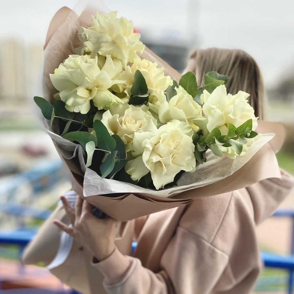 Букет из белых французских роз с эвкалиптом