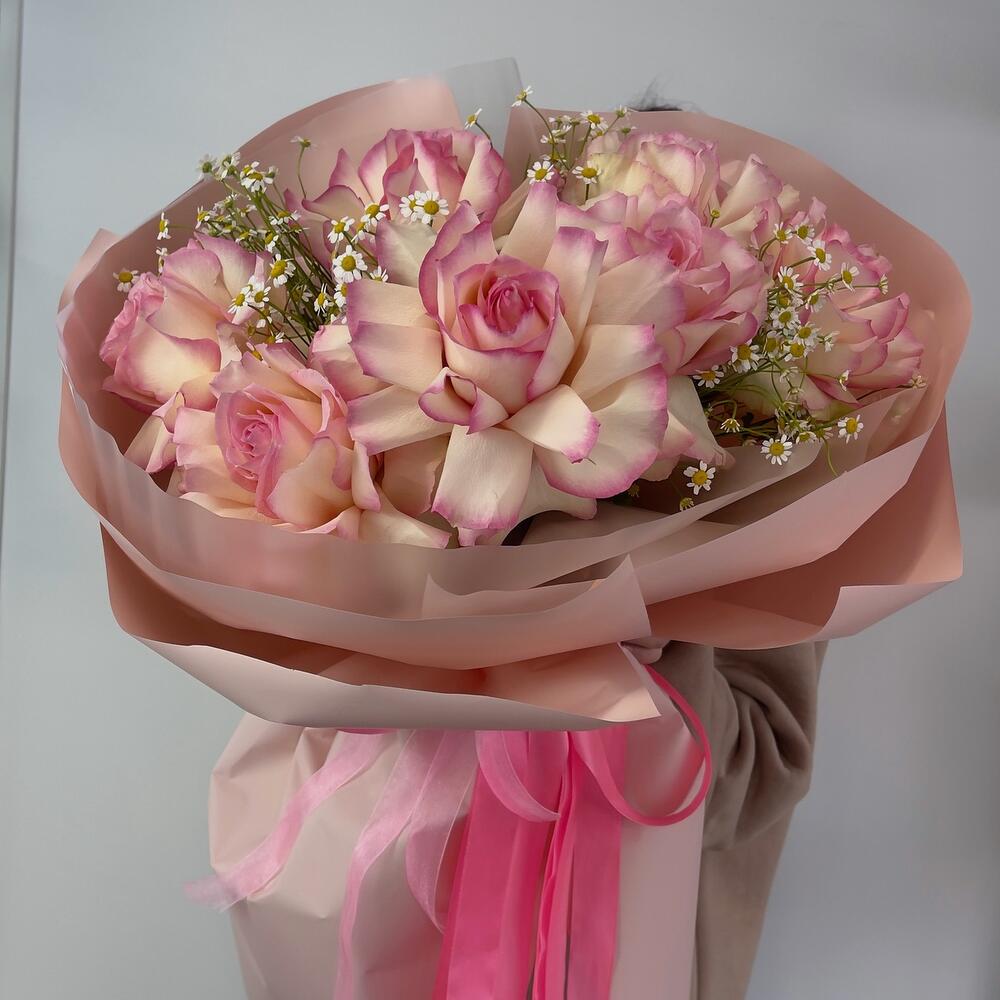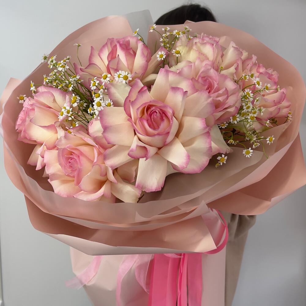 Тишью – 4 шт.Ромашка кустовая – 5 шт.Фисташка – 7 шт.Роза французская – 7 шт.Пленка матовая – 4 шт.
