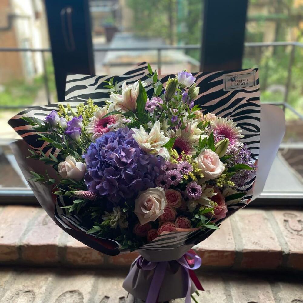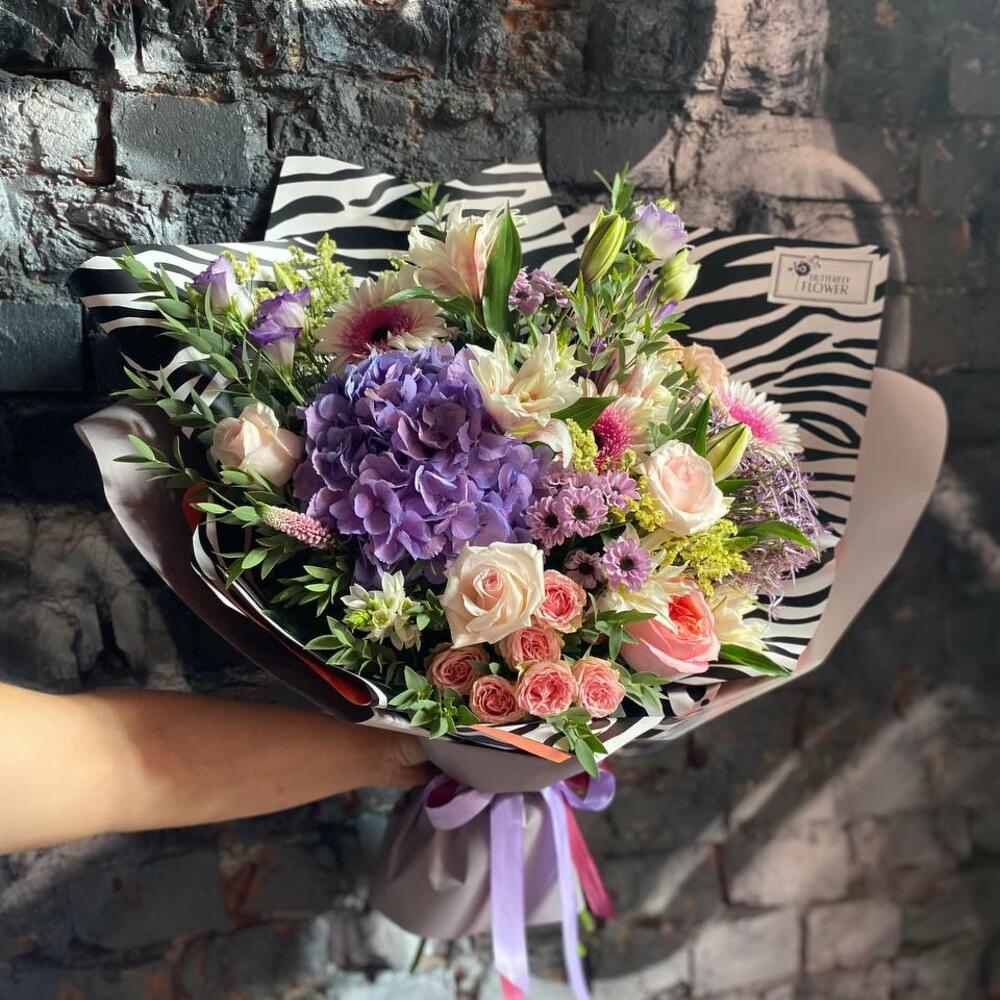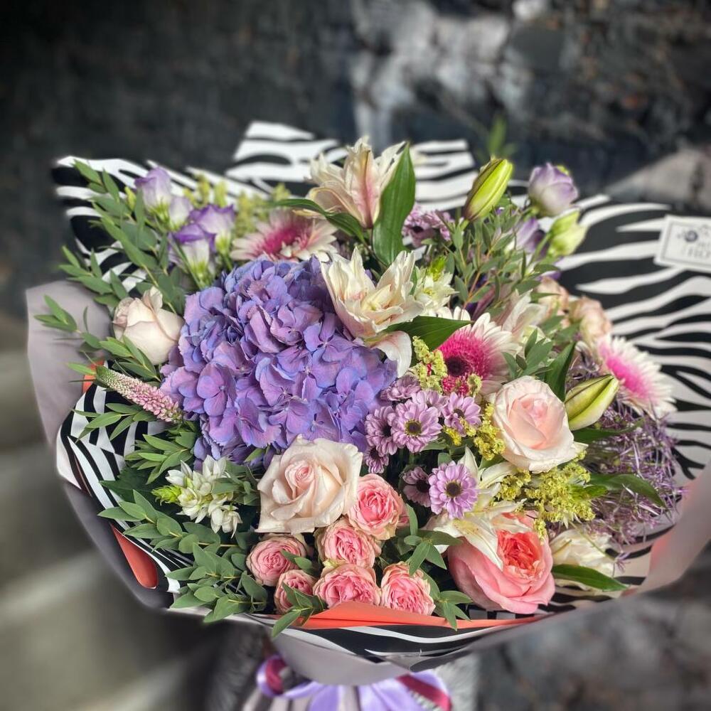 Букет из гортензии, роз, лилии, гербер, лимониума, сантини и эустомы в стильной упаковке Туманное поле
