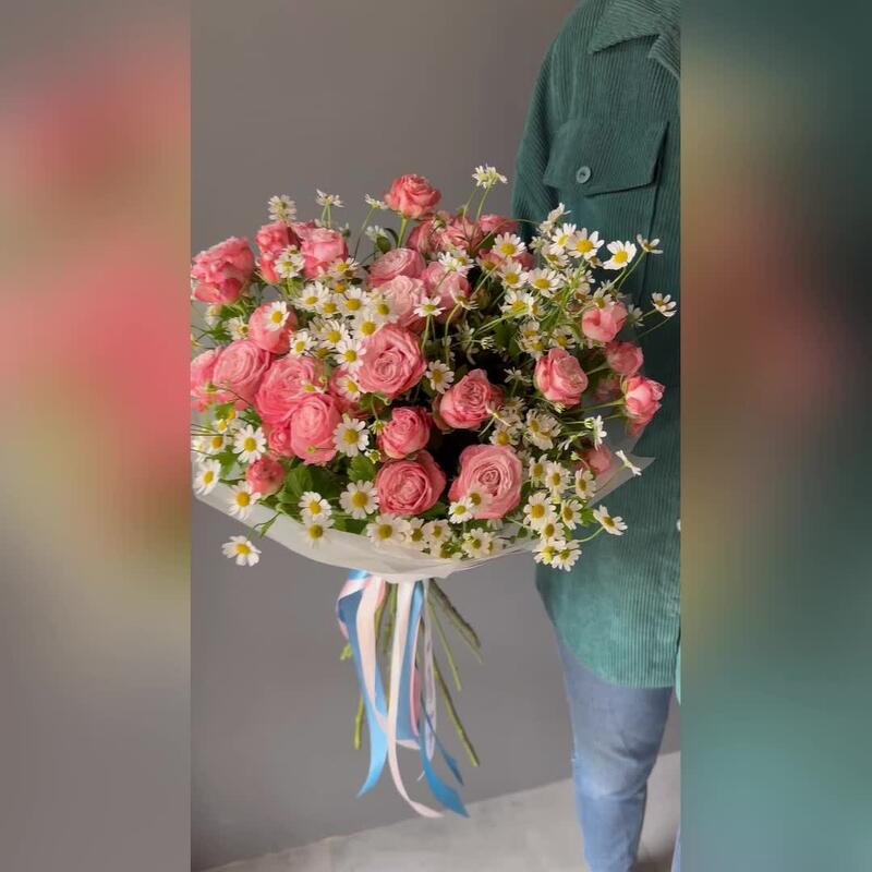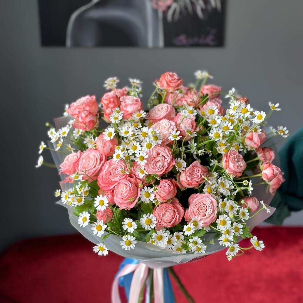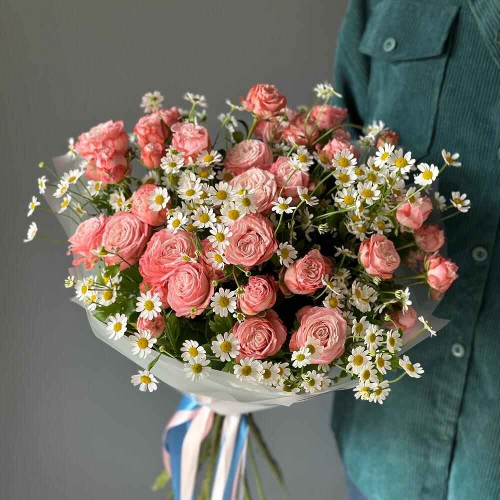 Кустовая роза Бомбастик – 6 шт.Атласная лента – 3 шт.Ромашка матрикария – 5 шт.Дизайнерская упаковка – 1 шт.