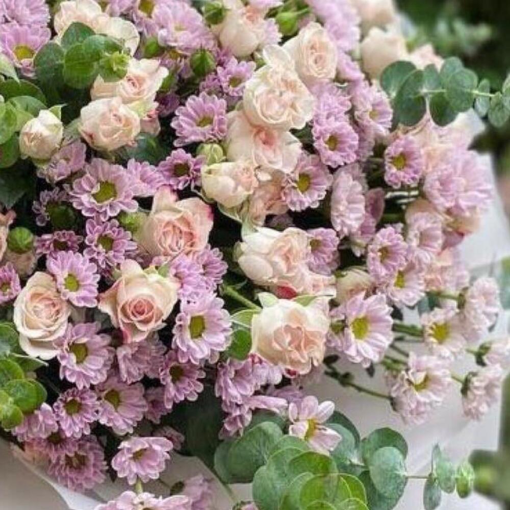 Кустовая роза – 39 шт.Кустовая хризантема – 39 шт.Эвкалипт – 21 шт.Упаковка дизайнерская – 2 шт.Лента атласная – 2 шт.Открыточка с вашими пожеланиями – 1 шт.хорошее настроение – 100 шт.инструкция по уходу за цветами – 1 шт.коробка переноска – 1 шт.Кризал – 1 шт.