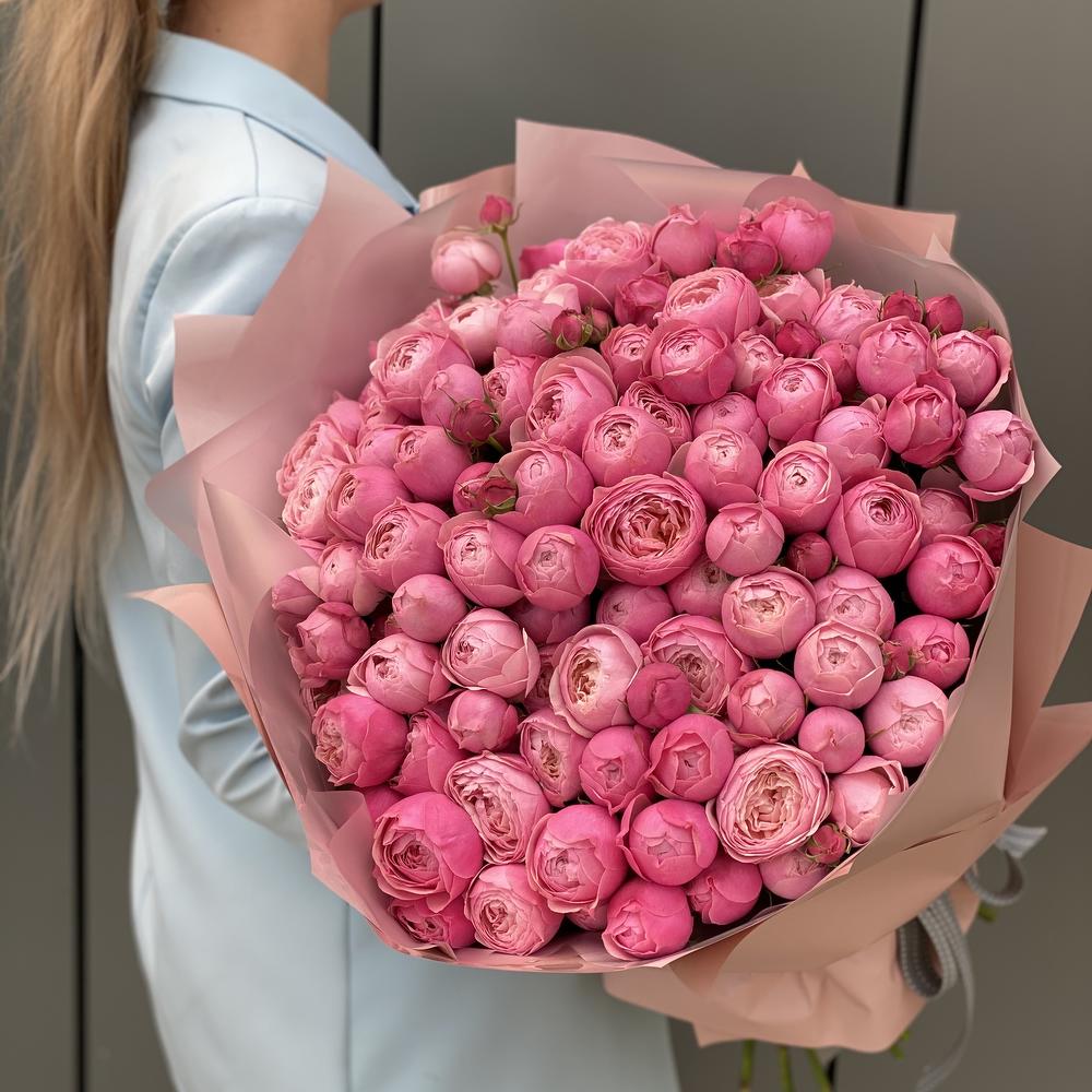 кустовая пионовидная роза сильвия пинк – 35 шт. Писташ – 7 шт. Оформление – 1 шт.