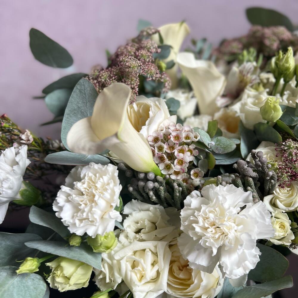 Калла – 8 шт.Роза одноголовая – 6 шт.Пионовидная роза – 7 шт.Амми – 3 шт.Лизиантус – 4 шт.Оксипеталум – 5 шт.Альстромерия – 5 шт.Гвоздика – 13 шт.Бруния – 5 шт.Хамелациум – 6 шт.Эвкалипт – 7 шт.