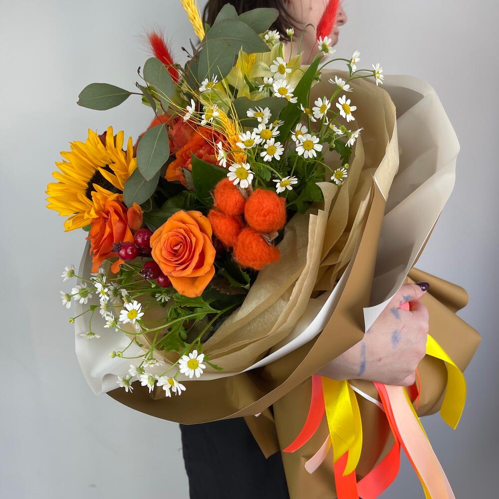 Альстромерия – 2 шт.Эвкалипт – 1 шт.Лента атласная – 2 шт.Роза Россия – 5 шт.Подсолнух – 1 шт.Рускус сочи – 5 шт.Пленка матовая – 4 шт.Хлопок натуральный – 2 шт.Лагурус (сухоцвет) – 3 шт.колосок полевой – 1 шт.ромашки кустовые – 2 шт.