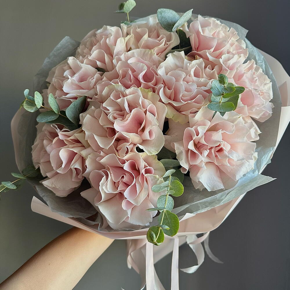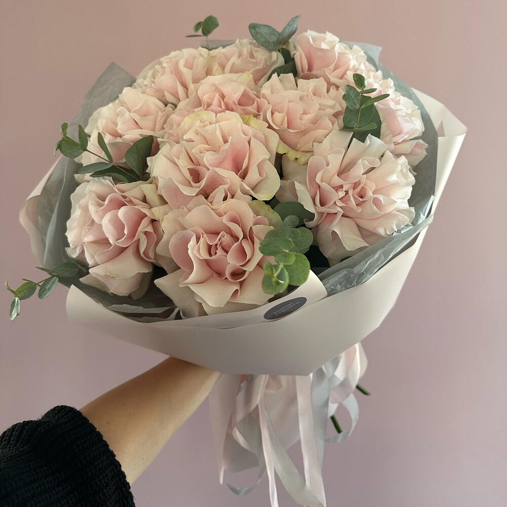 Букет из розовых французских роз с эвкалиптом