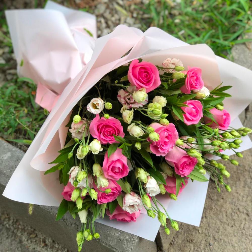 Роза розовая – 15 шт. эустома белая – 10 шт. Упаковка пленка матовая – 1 шт.