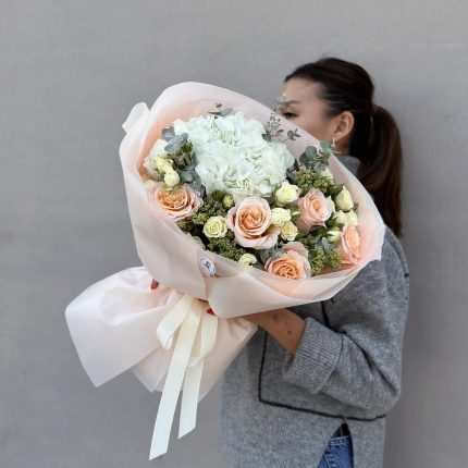 Нежный букетик из светло розовых роз и белых эустом, стильно оформленный в розовую упаковку.