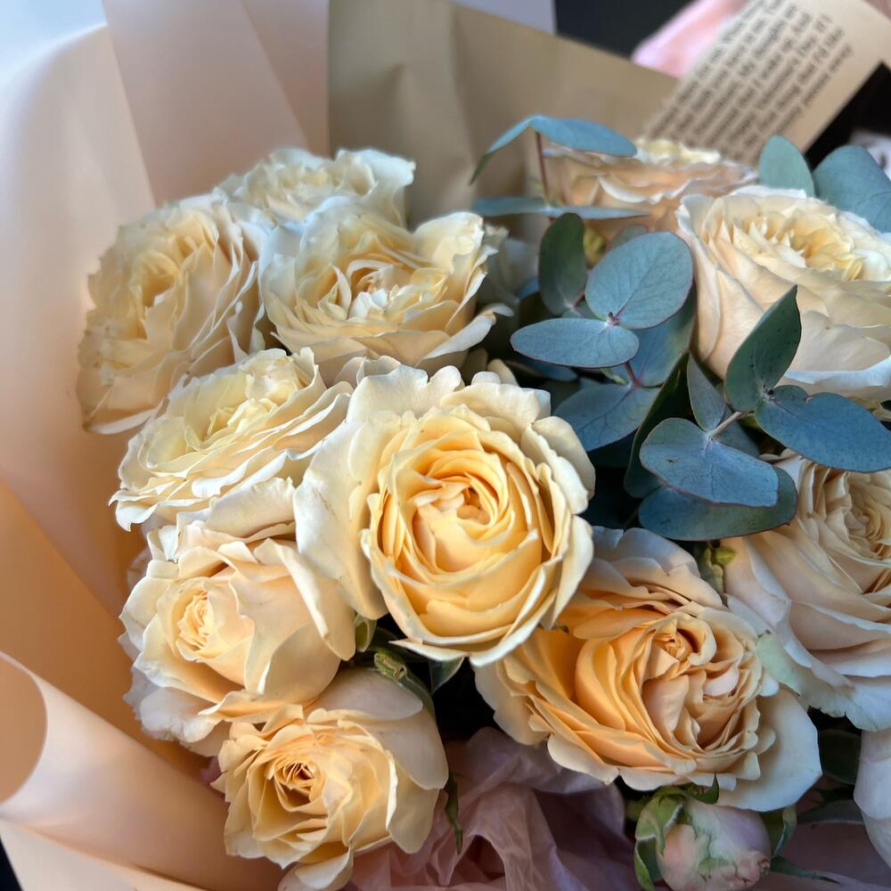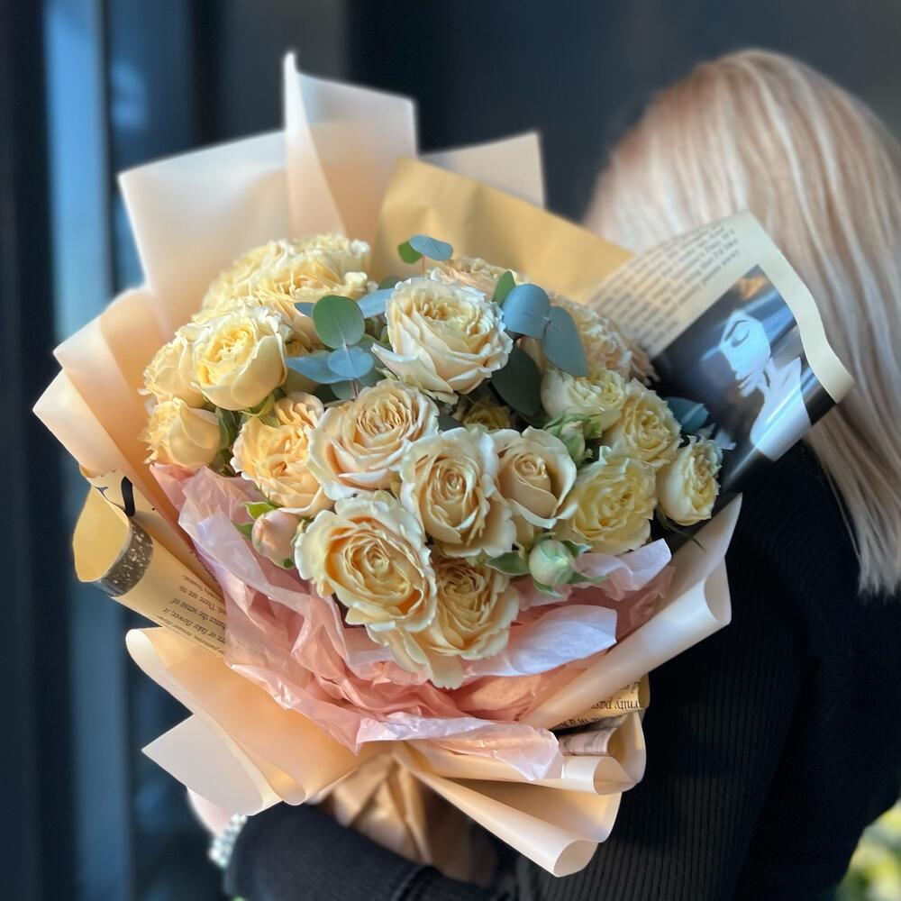 Кустовая пионовидная роза – 5 шт.Эвкалипт – 2 шт.Упаковка дизайнерская – 2 шт.Лента атласная – 1 шт.