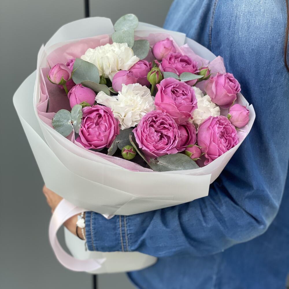 кустовая пионовидная роза misty bubbles – 4 шт. Гвоздика сортовая – 3 шт. Эвкалипт – 1 шт. Писташ – 2 шт. Оформление – 1 шт.